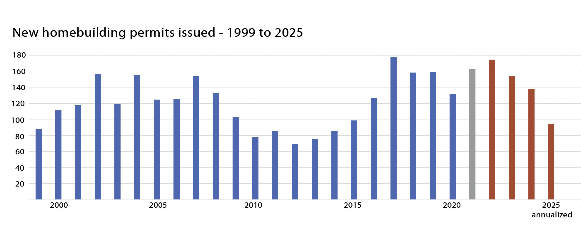 Let’s start with new homebuilding. In 2025, Prince Edward County is on track to issue 94 new homebuilding permits. If this pace holds to the end of the year, it will be the fourth year of steady decline— to the lowest level of homebuilding in over a decade.