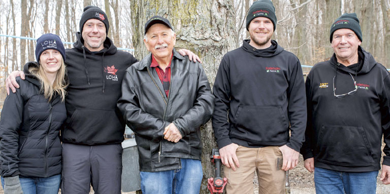 (L-R): Jessie and Chris Armstrong, Ron Hubbs, Rylan Foster and his dad Dean at the Foster’s sugar bush on County Road 18 at the kick-off for the 22nd annual Maple in the County Festival, which will take place on March 28 and 29. Visitors to LOHA Farms and Fosterholm Farms can enjoy a pancake breakfast with fresh maple syrup as well as see how maple sap is turned into the sweet spring elixir.