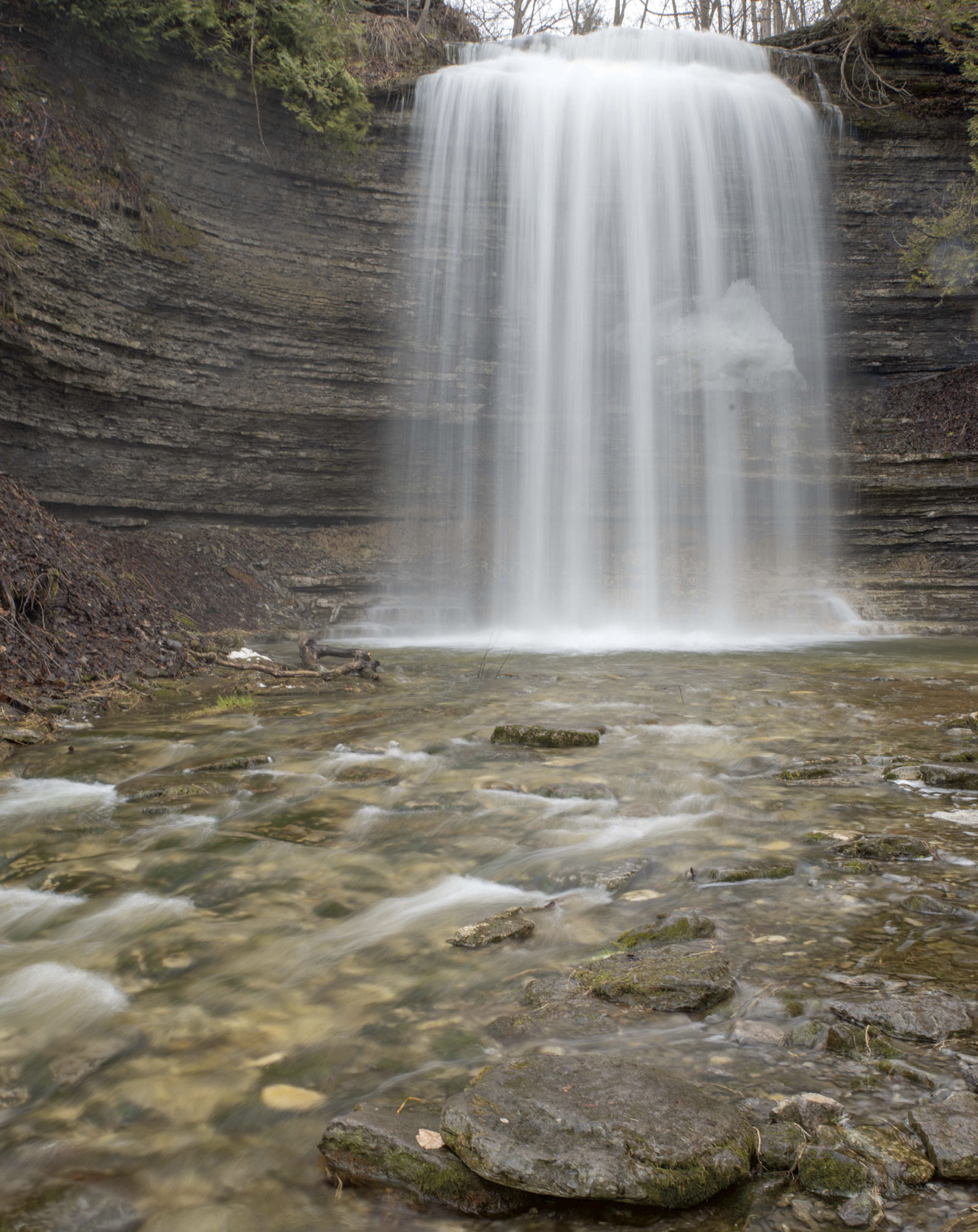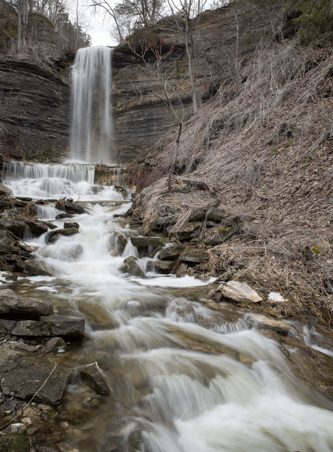 The falls at Cape Vesey have a long vertical drop before the water cascades down a rocky incline to a wide marsh on the shore of Lake Ontario. Even though it is still early springtime and the weather is cool, visitors to these falls were greeted by a chorus of frogs who call the marsh home. Jackson’s Falls are not quite as high as the one at Cape Vesey, but it is wider and the water appears as a delicate veil over the limestone cliff. A shallow stream of water flows into Black Creek. Sharp-eyed visitors noticed spawning fish in the pool beneath the falls. Many visitors come to see both falls year after year, and they make it a family outing, memorialized by the cell phone selfie. But the event also attracts die-hard shutterbugs who seek to capture a unique image of the falls.